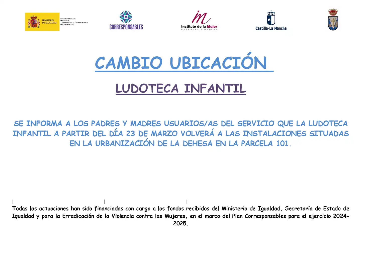 Se informa a los padres y madres usuarios/as del servicio que la ludoteca infantil a partir del día 23 de marzo volverá a las instalaciones situadas en la urbanización de la dehesa en la parcela 101.