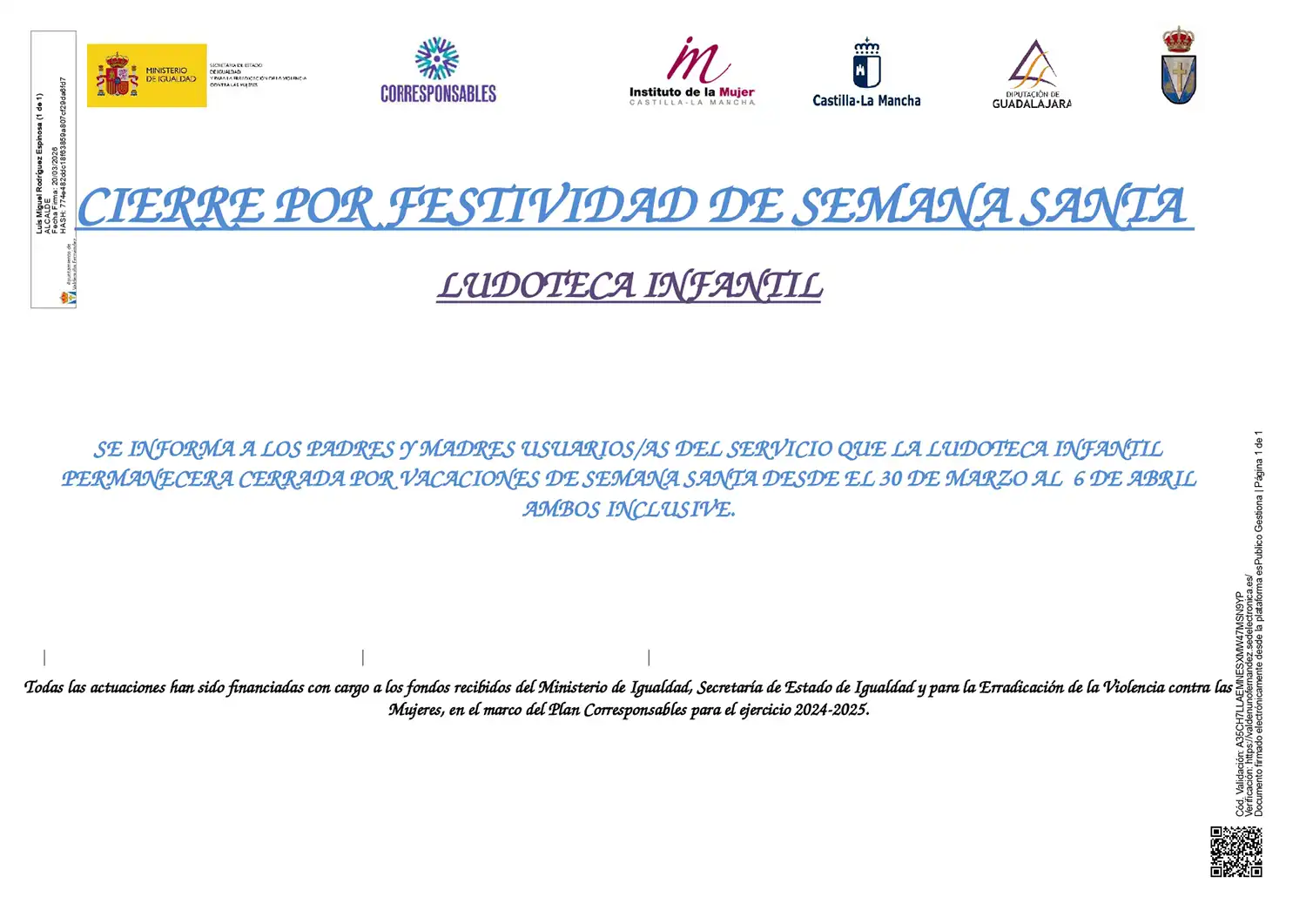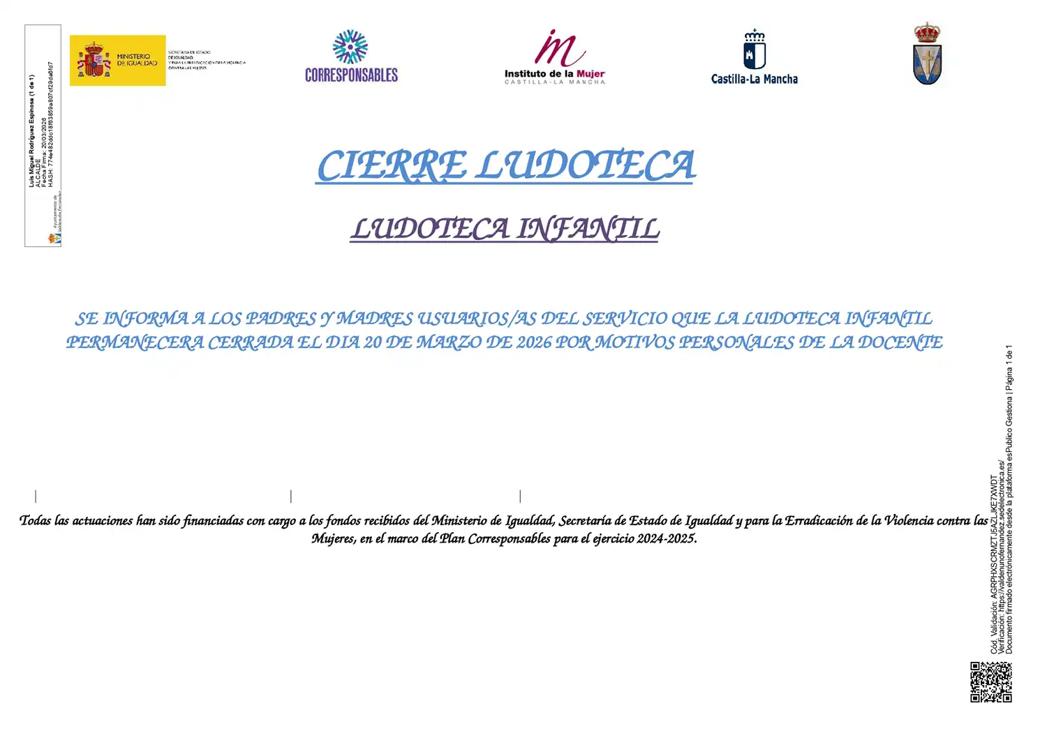 Se informa a los padres y madres usuarios/as del servicio que la ludoteca infantil permanecerá cerrada el día 20 de marzo de 2026 por motivos personales de la docente.